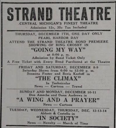 It appeared that a combination of “bond fatigue” and “war weariness” accounted for the struggles that Gratiot County had in meeting its goal for the Sixth War Loan Drive. Early in the month on Pearl Harbor Day, Alma barely exceeded its goal of $61,700 in bonds. The rest of the county total was at only 16 percent of its $1,103,000 goal. One way the city of Alma tried to encourage people to buy bonds was to sponsor a one-night showing of “Going My Way” at the Strand Theatre. Over 700 people purchased bonds to get a ticket for the Bing Crosby movie, and bond sales amounted to over $20,000 that night’s movie. The Fleming Store displayed a rubber boat that carried five men, a Merchant Marine life-saving suit, and different types of boots that the Army and Navy used – all from rubber products. The display tried to promote the bond drive. It would be corporations and places like Alma College, who kept buying bonds to keep Gratiot County on track of its goal. At one point, Alma College purchased $112,794 worth of bonds; another $398, 610 came from corporations. The American Legion, its Auxillary, and the Gratiot Conservation League pitched in with $7,500 for bonds.