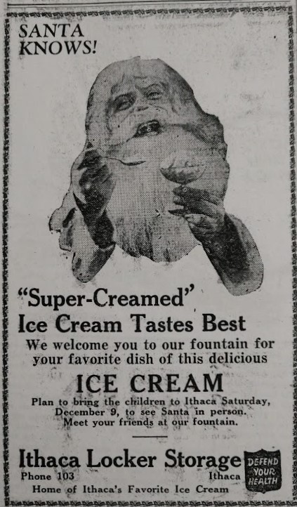 The service window of the Ithaca Red Cross had decorations done by Mrs. Rolland Crawford. In a picture, Crawford drew a scene with troopships in the Atlantic and landing barges arriving at islands in the Pacific. A Red Cross tent and insignia sat in the combat zone, the area overrun by tanks, planes, and guns. Above the drawing was writing that read “Red Cross Brings Christmas Everywhere.”