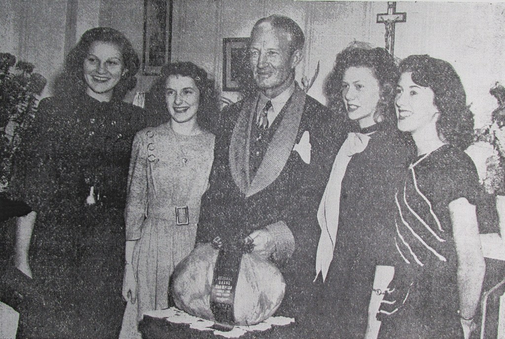 New events at the 1947 fest included the planned arrival of Michigan Governor Kim Sigler to preside over the activities. However, plans changed when Sigler underwent emergency surgery in Lansing. Hence, Lieutenant Governor Eugene C. Keyes came to Alma in Sigler’s place. After the Turkey Festival ended, Queen Elda Crittenden and her court traveled to Lansing to personally deliver the governor’s winning dressed bird. A picture shows the four girls with Governor Sigler wearing what appeared to be a hospital coat over his dress suit.