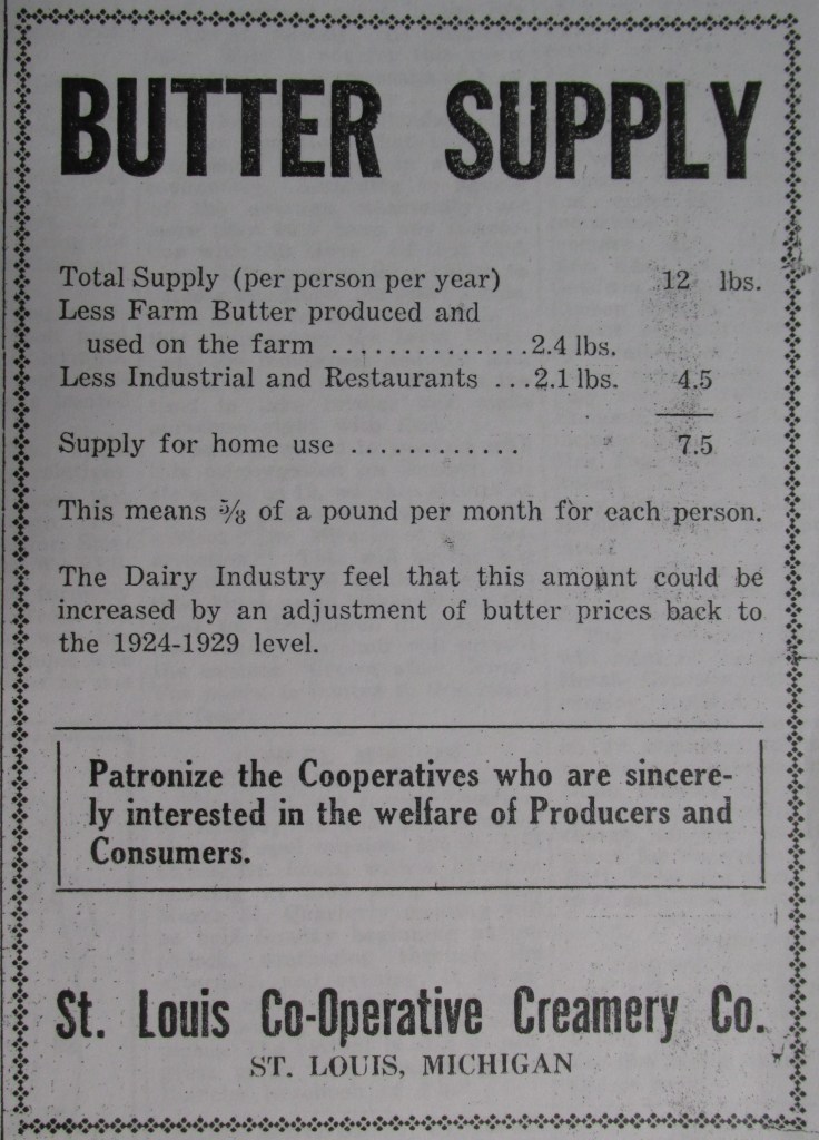 Other things faced rationing. The rationing board issued certificates for 110 tires, most going for grade one tires. Oleo margarine started to come into the news as places like the St. Louis Co-Operative Creamery warned customers that the creamery was not responsible for butter shortages. Dairy farmers were concerned about how the use of oleo affected the butter market. On a positive note, Alma businesses did very well in their observance of brown-out orders (the regulated use of outside and display lights). The Alma business community was said to be in 100 percent compliance. Finally, a notice appeared in the paper that young people collected 4,781 bags of milkweed in the county last fall.