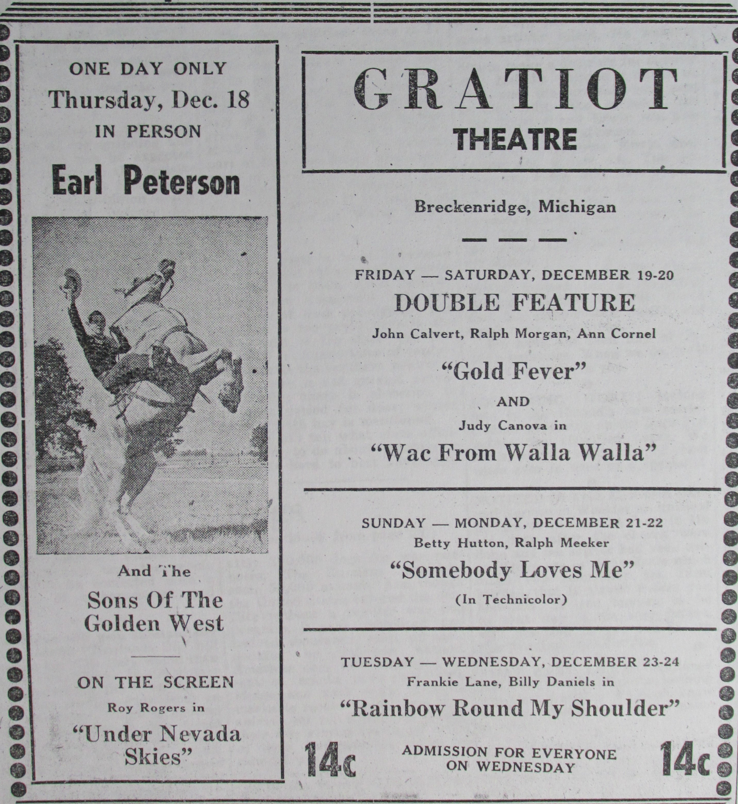 Owners frequently used promotions to get viewers into the Gratiot Theatre. During Christmas 1949, the theater gave away free turkeys on one Wednesday night. Barbershop quartets benefiting the American Legion held performances beginning in 1950. Another regular feature was “14 Cents Wednesday Nights.” In late 1952, Earl Peterson, “Michigan’s Singing Cowboy,” appeared on stage. Peterson and his group, Sons of the Golden West, came to the Gratiot more than once to give performances.