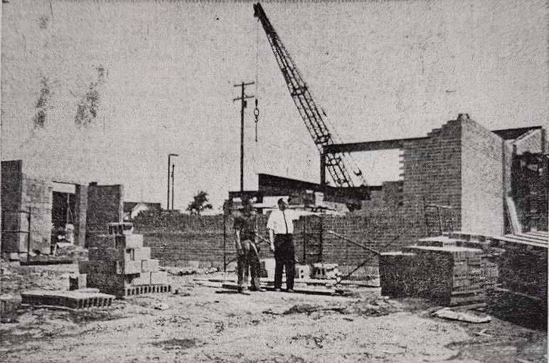 Contractor Harold Carter of Greenville shows new manager Jack Robbins of Alma around the Big Boy building site. It was June 1963.