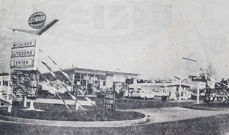Leonard’s Michigan Outdoors station was constructed with a large paved parking lot and a display room that could be seen from the road. A gas station and car maintenance center sat next door. When drivers traveling along US-27 needed a break or directions, they could pull into the parking lot to be greeted by a hostess who offered free coffee, directions, and maps. John Wood became Leonard’s first manager, and the station opened on November 1, 1963.