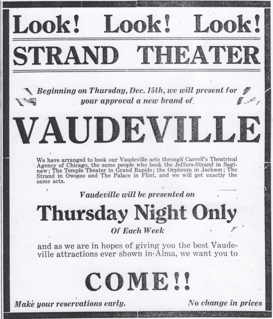 Mrs. Jennie Miner purchased the first brick building built in Alma. The Delavan House was completed in the fall of 1881 and was considered the finest home in Alma for many years…Carol Lee Monnette, born in St. Louis and granddaughter of Mr. and Mrs. A.J. Davis, appeared on the Milton Cross Bus Program over a New York City radio station. Lee was five years old and sang “Oh, Something Has Happened to My Little Bisque Doll”…Sherman Summerville lost his barn in an undetermined blaze that cost him $5,000. He lost fifty sheep, valuable machinery, and much hay and grain.