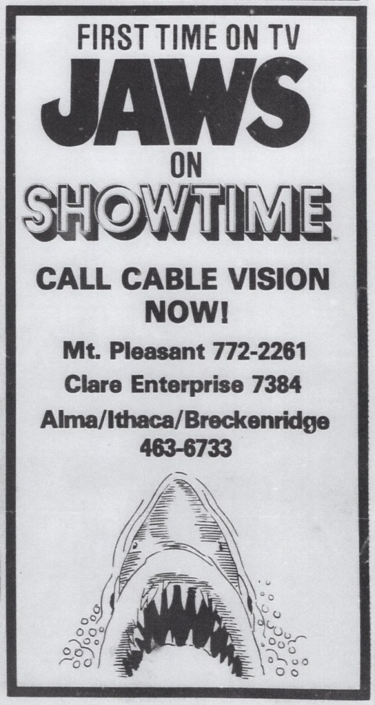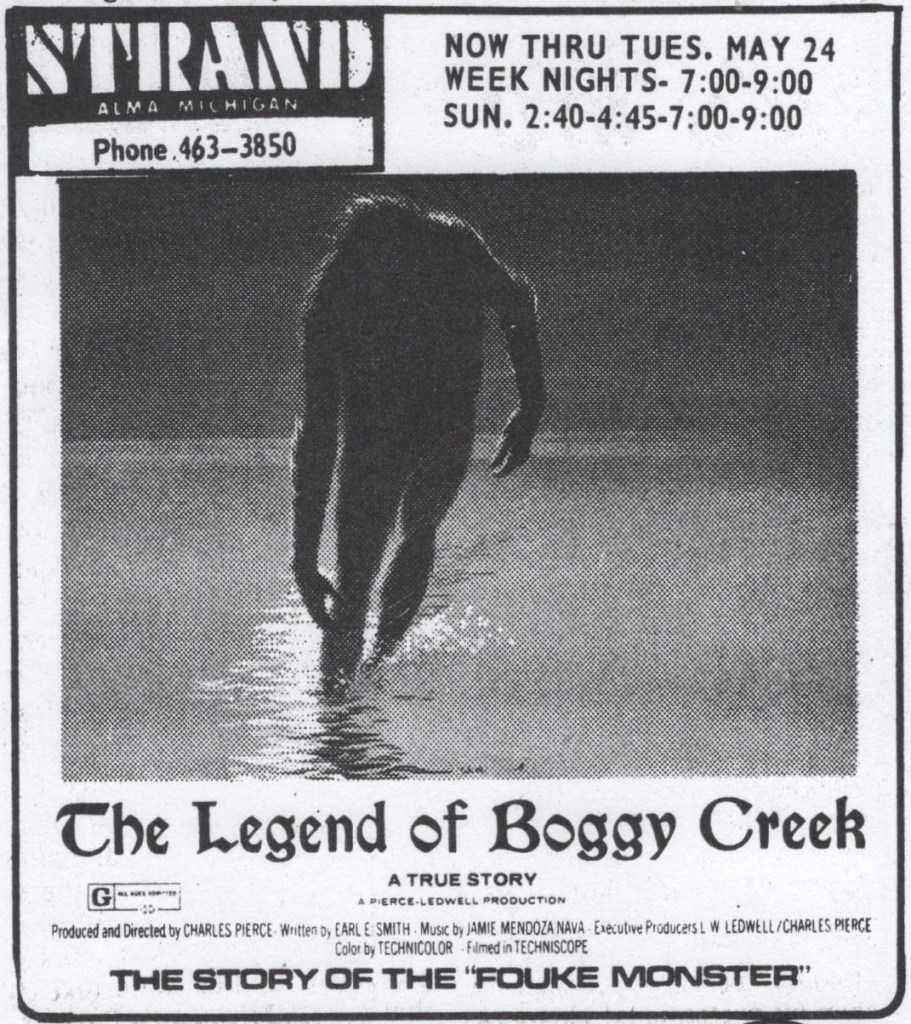 While many big movies of this decade came to Alma, most of the time, they appeared many months after their initial release. For example, “Jaws” (1976) did not arrive until six months after it debuted. In this case, a movie that created the “American Summer Blockbuster” took until December to be shown in Alma. An exception to this was “Star Wars,” which arrived only two months late in July 1917 and played for three weeks (the same movie played for thirteen weeks in a row in Mt. Pleasant). Between the 1970s blockbusters, there were often reissues of older films, such as three showings of “Gone with the Wind,” which appeared between 1970 and 1974. Movies that featured Bigfoot documentaries also became a fad.