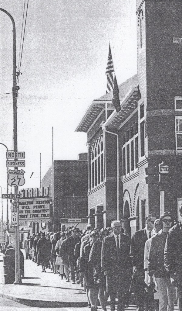 In 1970, one often saw long lines of Strand Theatre patrons that extended down the sidewalk on East Superior Street. Many nights, people waited to buy tickets for the next show or to be first in line after missing out on a previously sold-out movie. Despite the crowds, the Stand faced challenges that decade, like the emergence of the nationwide rating system and the playing of adult movies. Across the country, adult-rated movies drew large numbers of moviegoers and produced handsome profits for theatre owners. Many parents wanted a rating system and opposed showing adult movies in Gratiot County. The Strand Theatre also faced competition from places like the newly built Campus Twin Indoor Theatre in Mt. Pleasant and the nearly Skytop Drive-In west of St. Louis. New releases came faster to Mt. Pleasant, where people watched movies in the convenience of a modern theatre. In response to sparse attendance, owners of the Skytop started showing adult movies, and the number of cars skyrocketed. To keep up business, the Strand was tempted to show similar movies.