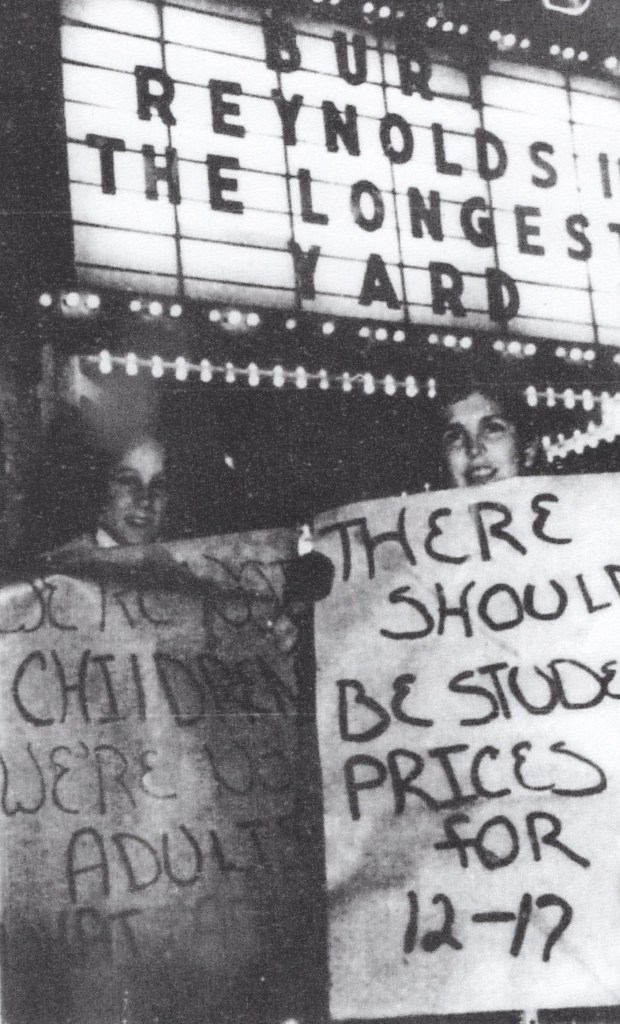 One event at the Strand in the 1970s centered around young viewers. In January 1975, two Alma Middle School students, Chris Tobin and Barb Hunter, led a group of fifty youngsters who protested the prices charged for 12-17-year-olds (the cost was $2.00 a ticket). The two girls and their group presented a petition to manager Harvey Freeman demanding that the Strand lower the price of tickets for these young people to a more median level. The group then went and picketed outside the Strand during “The Longest Yard,” which starred Burt Reynolds. The next day, newspapers reported that in response to the student’s demands, Freeman tore the petition up and then bluntly stated that there would be no price changes in tickets.