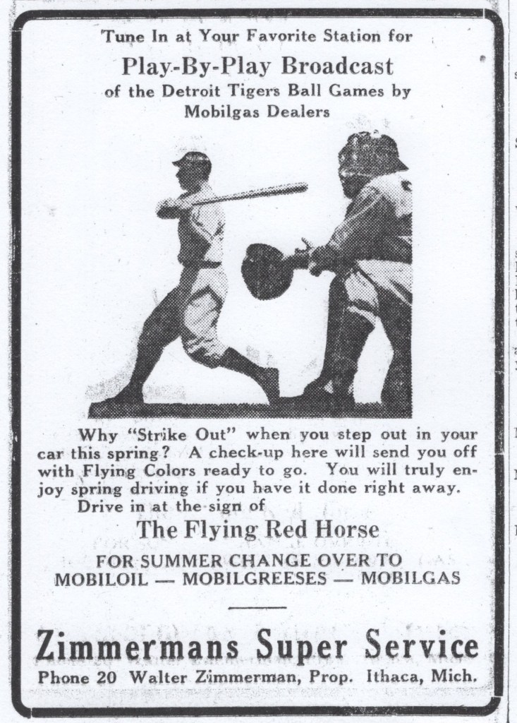 Medler Electric Company in Alma sold Thor Washers for $54.50. Buyers got a washer, wringer, and ironer all in one. Just stop by at Medler’s opposite the Fire Hall…WSAM Radio opened as Saginaw’s radio station. Tune in at 1200 to hear the Voice of Saginaw…Leslie D. Reeves of Ithaca married Nellie C. Grayson of Paxton, Illinois…Earle Trudgen again directed and led the Spring Concert in Ithaca. This would be the first of seven concerts by the Ithaca High School Band…Fulton High School Athletic Association held its annual sports banquet in the Perrinton gym. It drew 130 people who dined on roast pork. Captain Ronald Vining accepted the baseball awards…Bowling season concluded in early May in Ithaca. Ithaca’s top men’s team planned to bowl the top women’s team to see who was better. Two opponents included Elsie Ringle and Bill Ginther…The Pere Marquette railroad in St. Louis repainted all its buildings for $500. The depot received new paint inside and out, and the walls and furniture were either painted, sanded, or varnished. The freight house also got a new paint job. The “St. Louis” sign on the top of the depot was the first to be painted…The Fulton baseball team defeated Corunna by the score of 9-5. After combining tryouts from Middleton and Perrinton, Coach Lloyd Eberly had thirty boys to choose from…Fleming Clothing Company of Ithaca offered Hummingbird Hose to buyers who shopped for Mother’s Day. Hose costs 79 cents to $1.15, depending on the thread types…Clara Kellsey, longtime postmistress at Bannister, died at age 61. She had been a postmistress for many years.