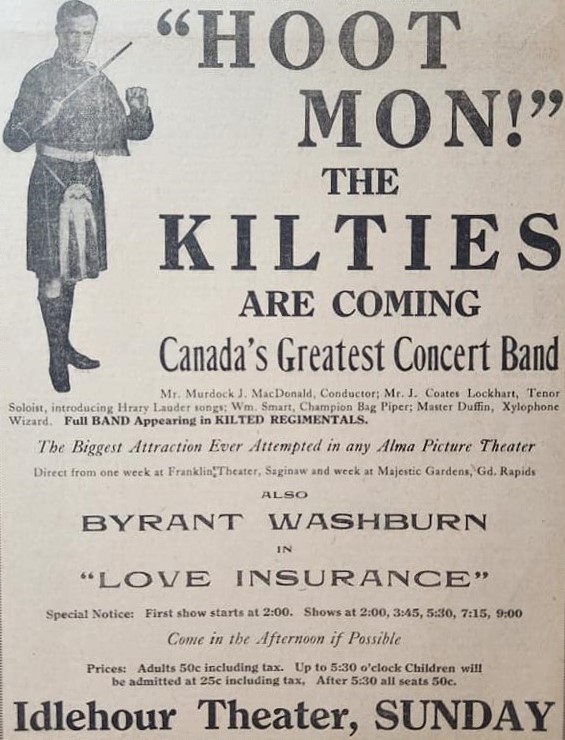 Movies in Alma in 1919 from the top: Houdini at the Idlehour Theater in May 1919; the Kilties come to Alma at the Idlehour, October 1919; “washed air” arrives at the Idlehour prior to the onset of summer, June 1919.