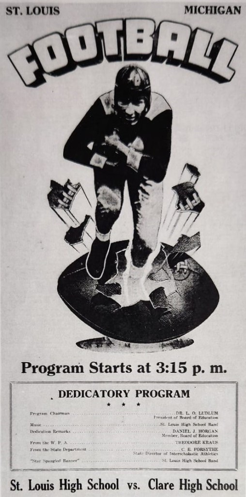 One of the essential New Deal programs that gained notoriety in October centered around Wheeler Field in St. Louis. The first game and dedication of the new field occurred on the afternoon of Friday, September 29. The game against Clare began at 3:00 pm in heavy rain, which continued for most of the afternoon. During half time, a program involved speakers from the Board of Education, Works Progress Administration, and the State Director of Interscholastic Athletics. The field was then officially dedicated and opened in memory of Dr. Aaron Wheeler, St. Louis doctor, mayor, and former school board member. The St. Louis Crimson Tide played hard but lost a wet game to Clare by the score of 24-12. Newspapers reported that the St. Louis team played much better than the previous game’s loss to Ithaca.