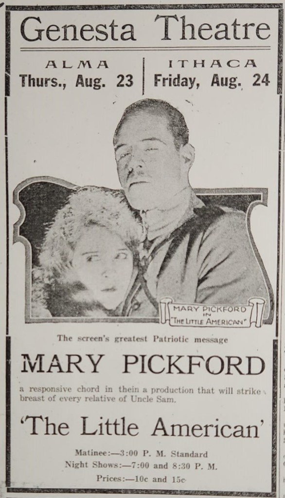 The Genesta Theatre attempted to further combat competition by installing a new Emerald Glo screen that eliminated distortion. Genesta also featured movies with war themes like “War Brides,” “Civilization,” and “Mothers of France.” Sometimes, he tried to sell more tickets by putting on some of his magic and illusion acts, such as “The Great Genesta.” Once the United States officially entered the war in April 1917, Genesta opened his theatre for high school students and gave Red Cross benefit shows. Genesta did this while maintaining this theatre and another one he bought in Ithaca. Sadly, shortly after the government forced the closing of movie theatres on Sundays to conserve fuel for the war effort, Genesta surprised many by selling his Alma theatre and appearing for a moment to move on from the movie business.